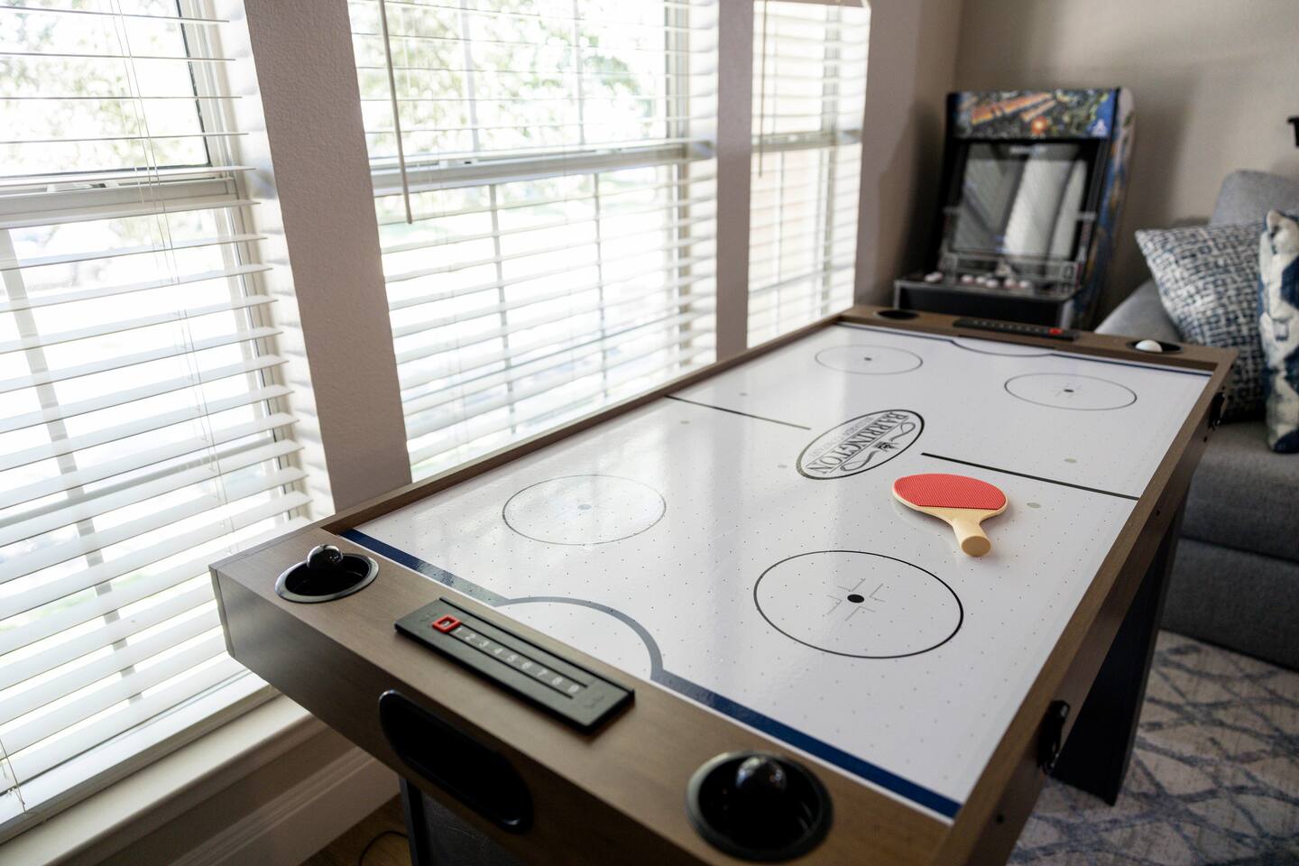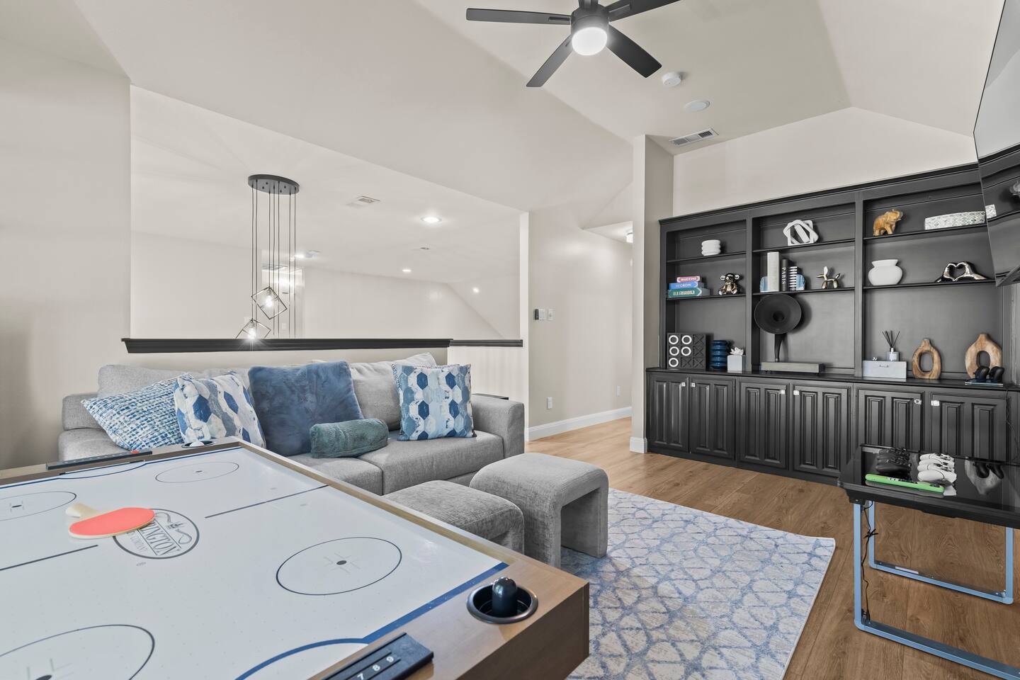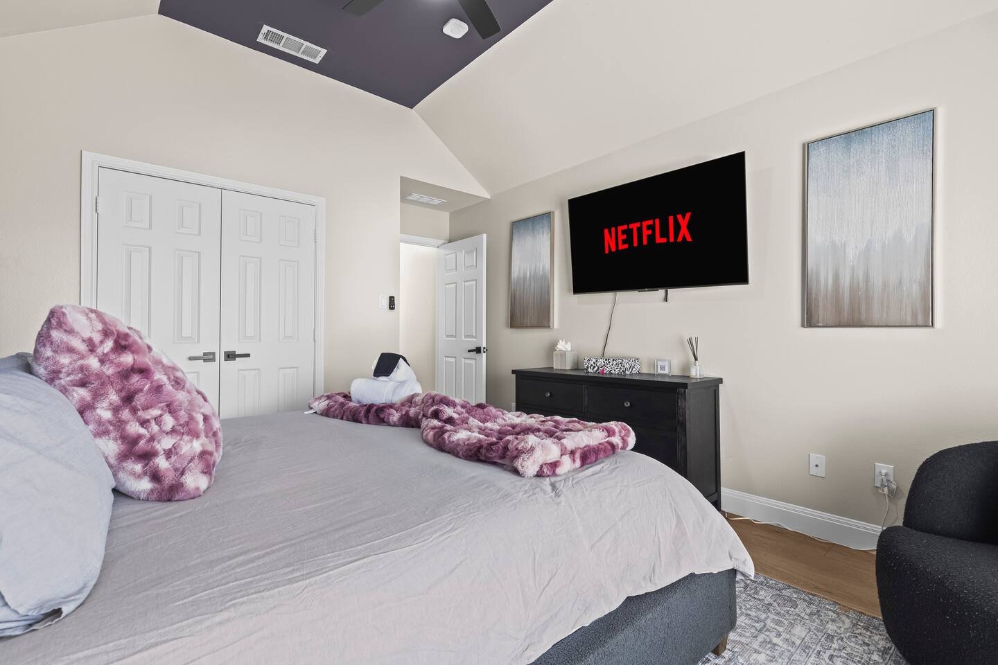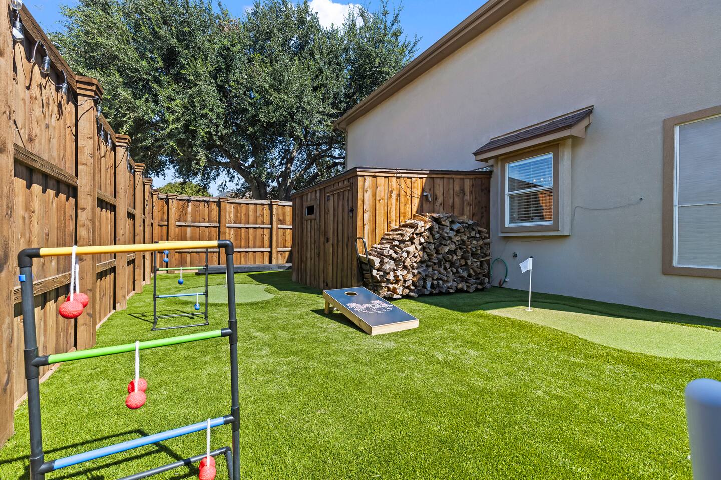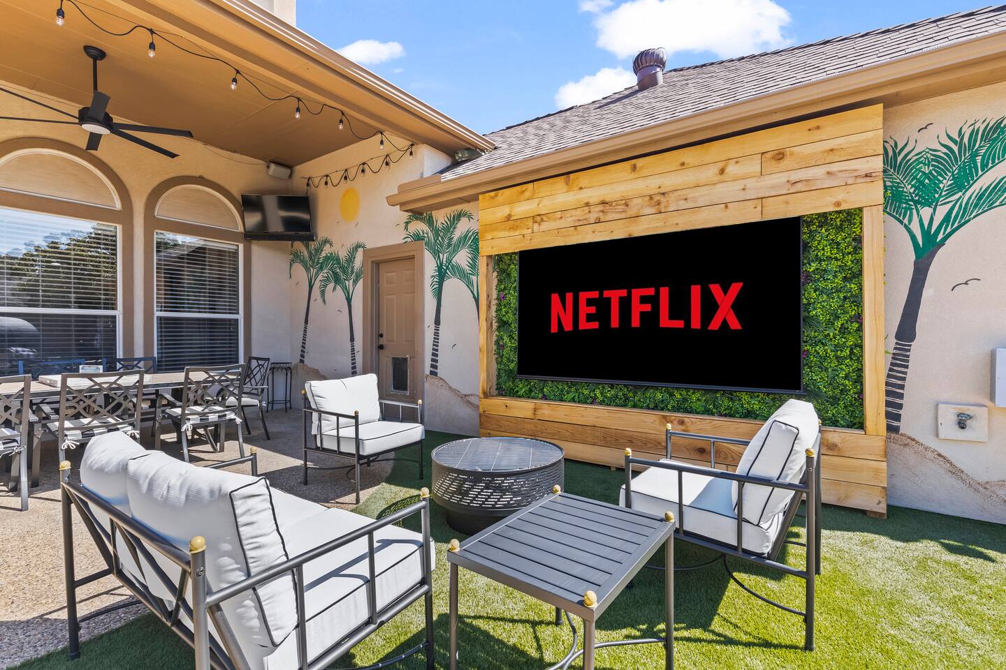 Welcome to The Palmera, a luxury retreat in Frisco’s Plantation Resort golf community! Relax in the heated pool, spa, sauna, or outdoor shower, watch movies outside while making s'mores, and enjoy outdoor bowling, skee ball, lawn games, and 2 putting greens. Inside, the game room offers foosball, ping pong, arcade classics, Xbox, Nintendo Switch & board games, plus a separate workspace with fast Wi-Fi. Close to shopping, dining, and top golf courses including PGA Frisco & TPC Craig Ranch!