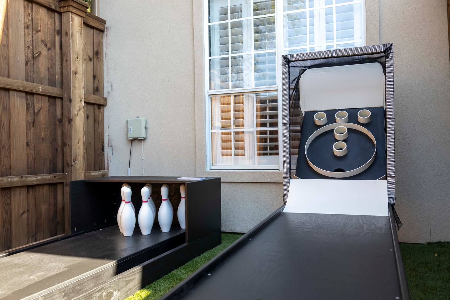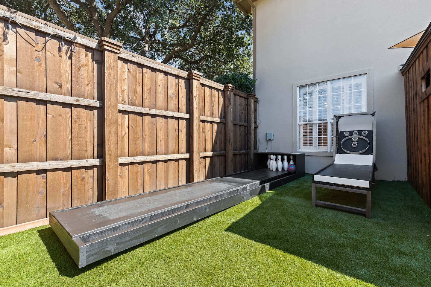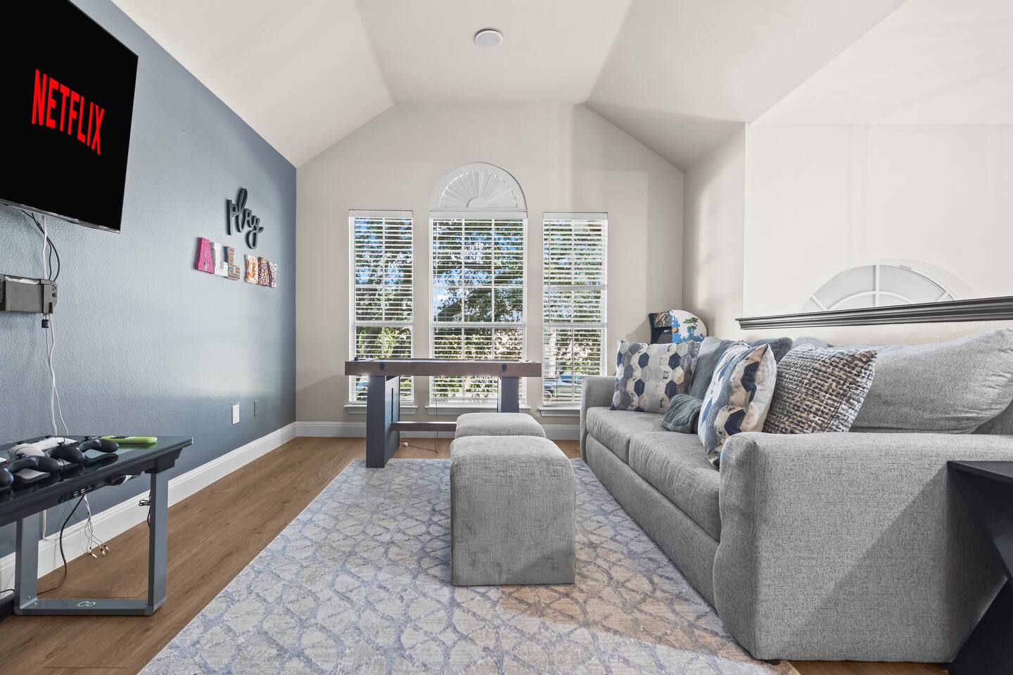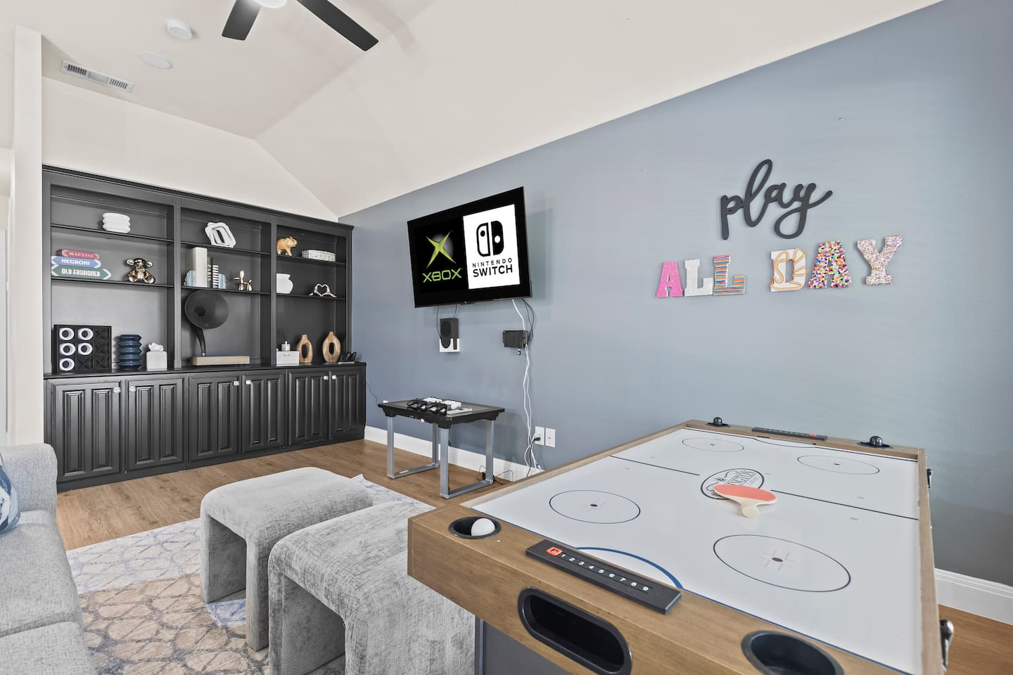 Welcome to The Palmera, a luxury retreat in Frisco’s Plantation Resort golf community! Relax in the heated pool, spa, sauna, or outdoor shower, watch movies outside while making s'mores, and enjoy outdoor bowling, skee ball, lawn games, and 2 putting greens. Inside, the game room offers foosball, ping pong, arcade classics, Xbox, Nintendo Switch & board games, plus a separate workspace with fast Wi-Fi. Close to shopping, dining, and top golf courses including PGA Frisco & TPC Craig Ranch!