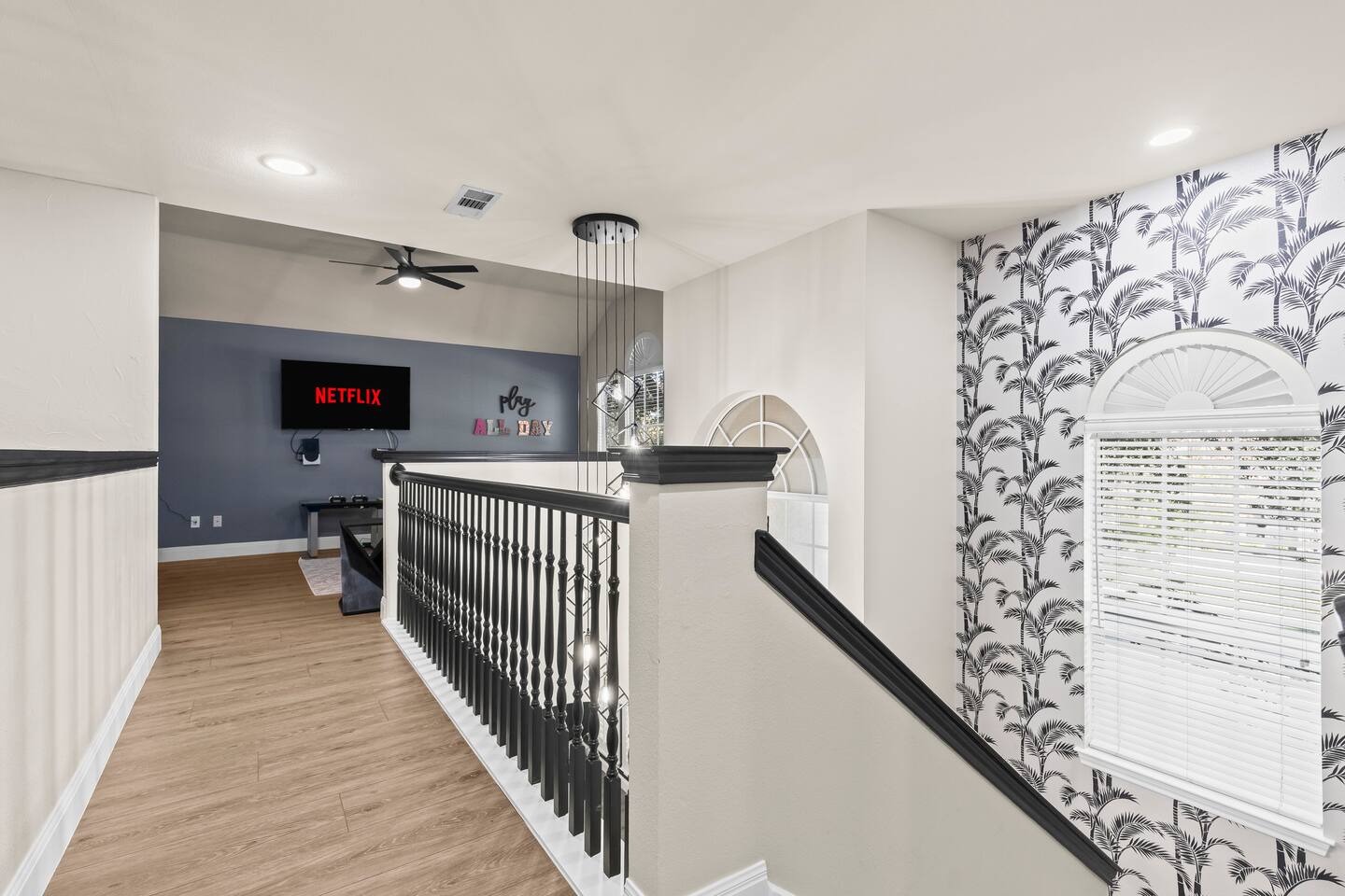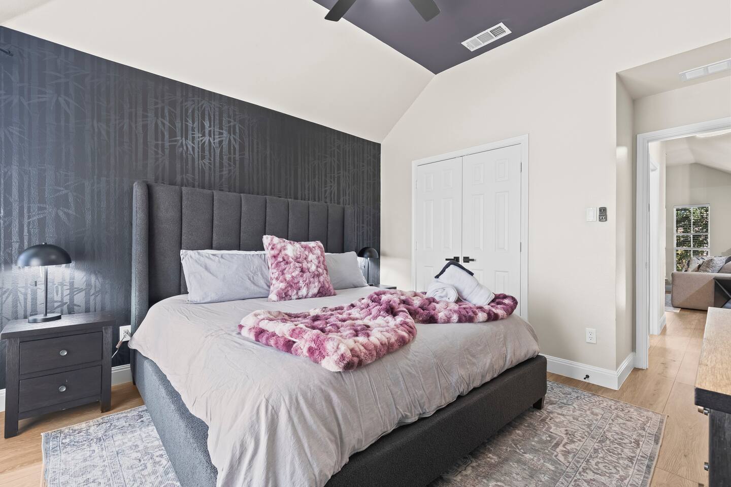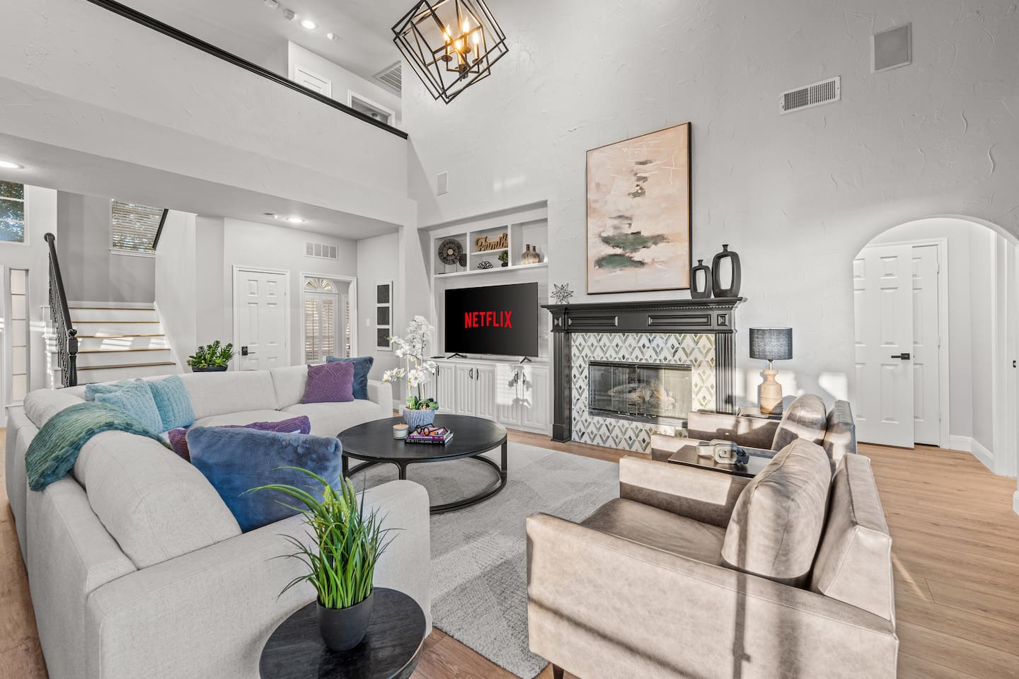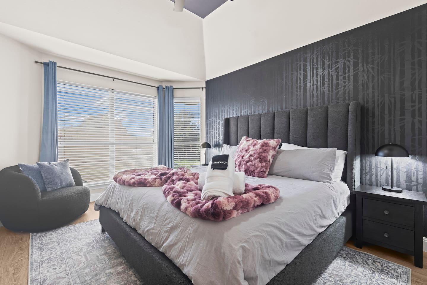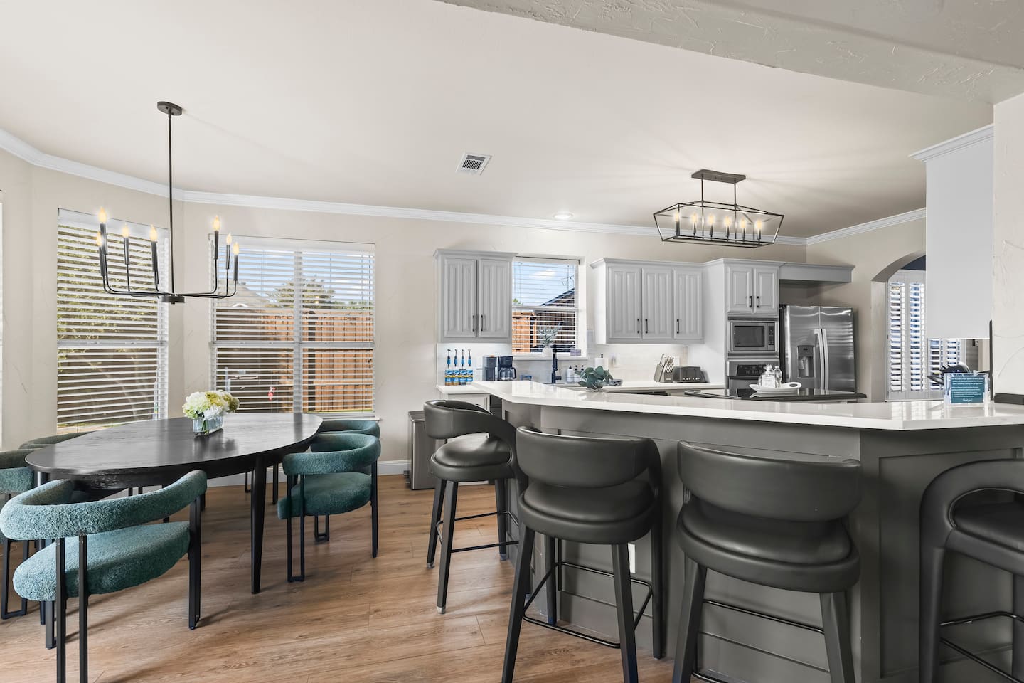 Welcome to The Palmera, a luxury retreat in Frisco’s Plantation Resort golf community! Relax in the heated pool, spa, sauna, or outdoor shower, watch movies outside while making s'mores, and enjoy outdoor bowling, skee ball, lawn games, and 2 putting greens. Inside, the game room offers foosball, ping pong, arcade classics, Xbox, Nintendo Switch & board games, plus a separate workspace with fast Wi-Fi. Close to shopping, dining, and top golf courses including PGA Frisco & TPC Craig Ranch!