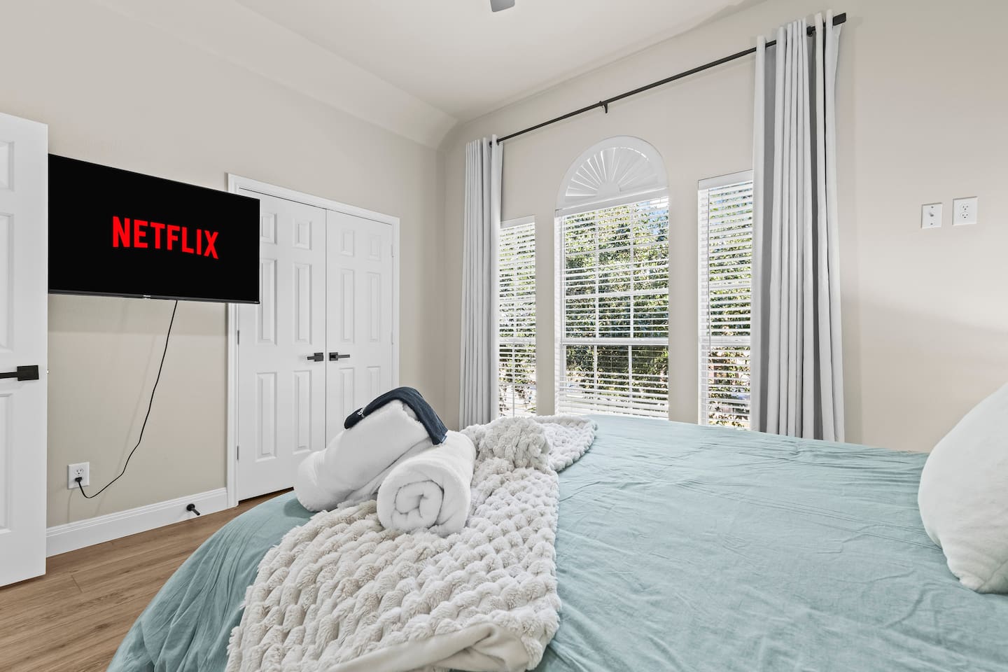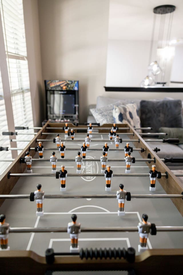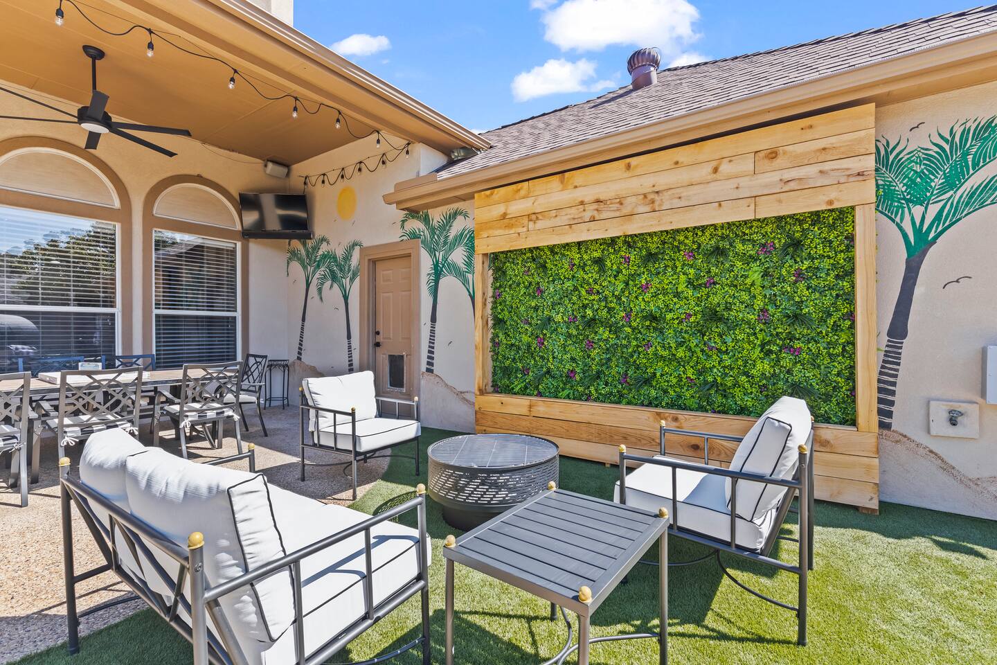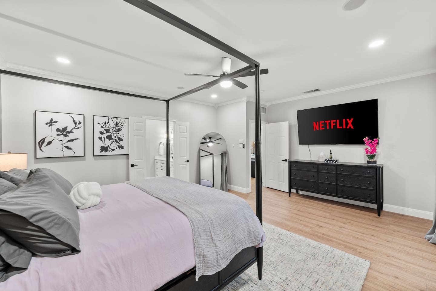 Welcome to The Palmera, a luxury retreat in Frisco’s Plantation Resort golf community! Relax in the heated pool, spa, sauna, or outdoor shower, watch movies outside while making s'mores, and enjoy outdoor bowling, skee ball, lawn games, and 2 putting greens. Inside, the game room offers foosball, ping pong, arcade classics, Xbox, Nintendo Switch & board games, plus a separate workspace with fast Wi-Fi. Close to shopping, dining, and top golf courses including PGA Frisco & TPC Craig Ranch!