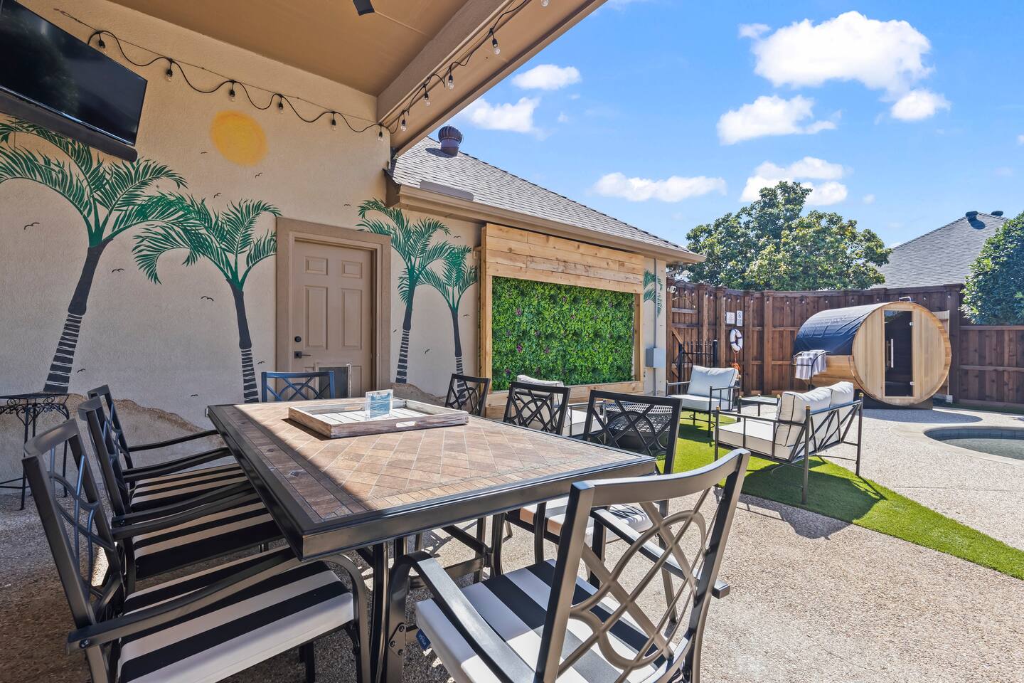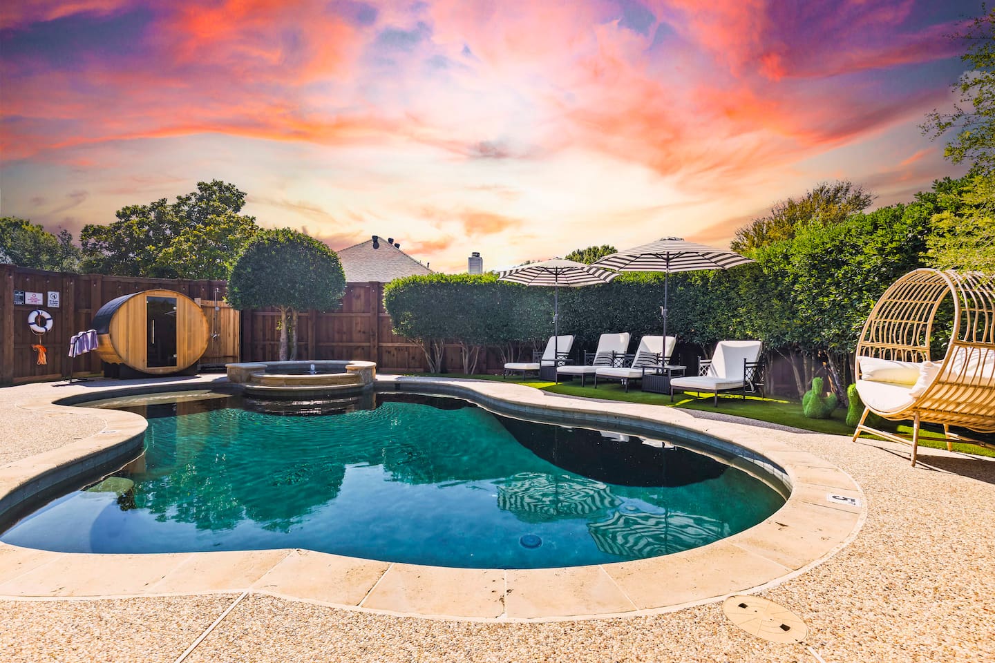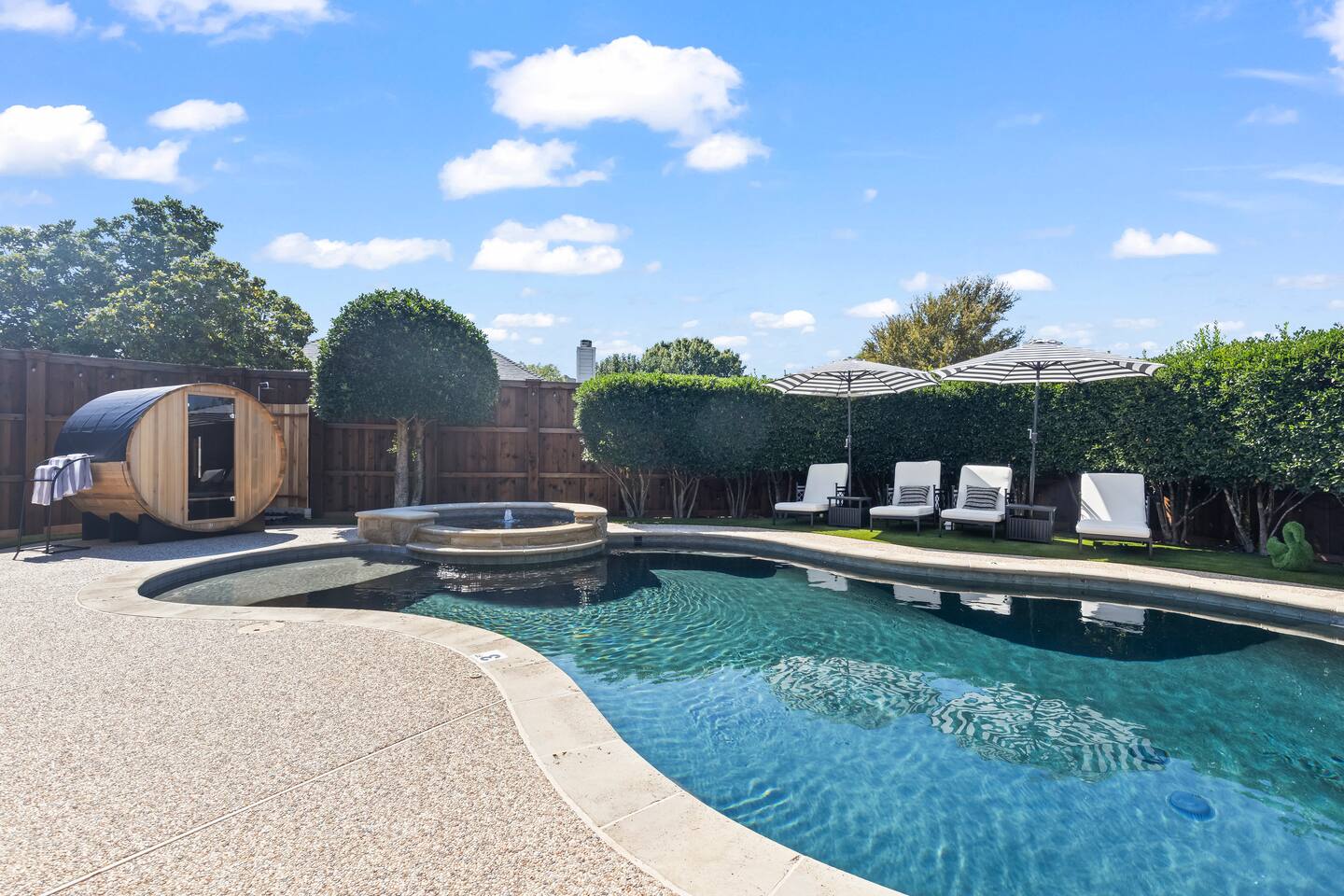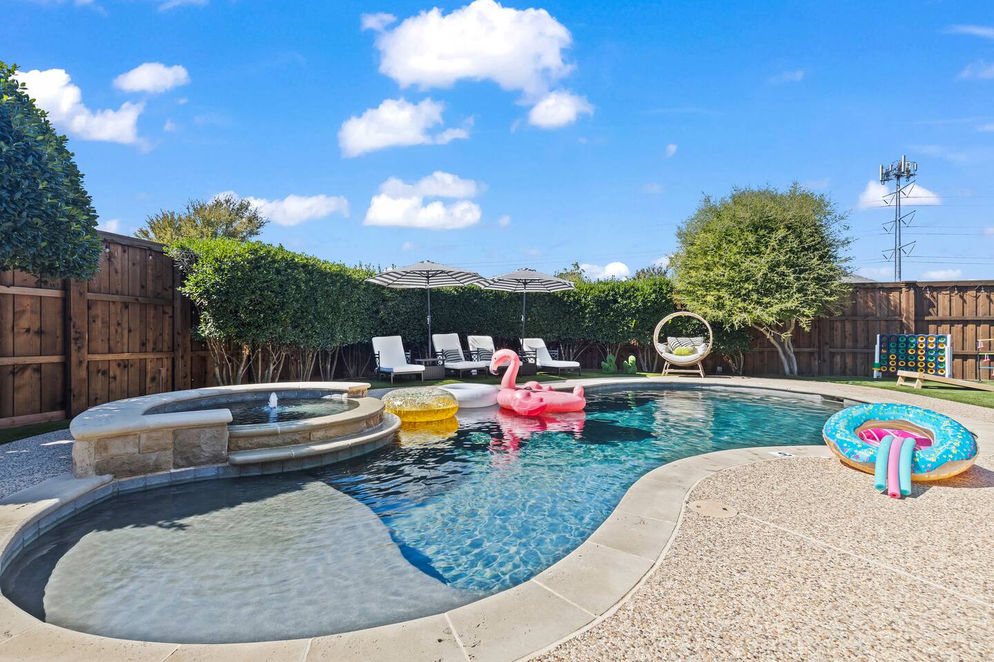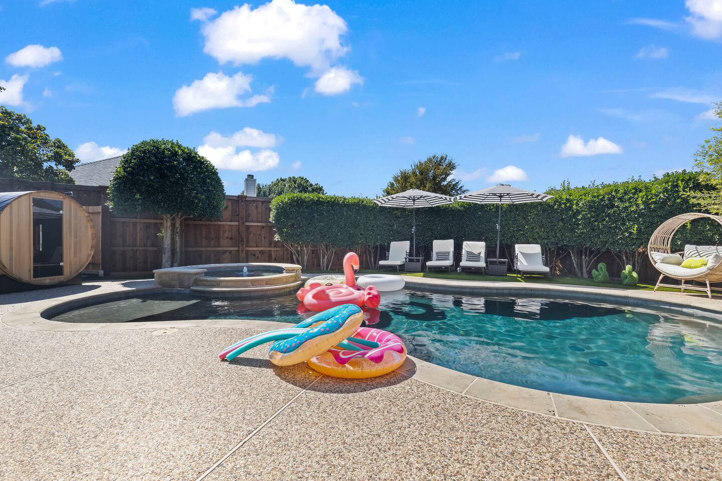 <b>NEARBY ATTRACTIONS</b> 📍 8 minute drive to Downtown Frisco 📍 5 minute drive to Stonebriar Shopping Mall 📍 8 minute drive to PGA and The Star 📍 30 minute drive to DFW Airport 📍 30 minute drive to Dallas Cowboys Stadium 📍 35 minute drive to Downtown Dallas 📍 35 minute drive to American Airlines Center 📍 35 minute drive to Texas State Fair 📍 35 minute drive to DAL Love Field Airport 📍 50 minute drive to Stock Yards in FT Worth <b>AMENITIES</b> 🔥 SAUNA for 3 to 4 adults 🚿 Outdoor Shower (available seasonally; closed in winter due to freeze protection) 🌞 Enjoy the turf grass installed in backyard for a pristine & clean outdoor experience! 🛏️ LUX memory foam mattresses 🔌 All bedrooms have USB ports for easy phone charging 💤 Room darkening curtains for the best sleep 💻 Executive Office w/ docking station 🎮 Brand new arcade games and electronic multi game table! 🎲 Tons of Board Games and Digital Arcade games! 🎲 Jumbo Connect 4 in the yard! 🦩 Pump provided for the pool floats 🍹 Outdoor 8-person Dining Table ⛱️ Outdoor 4 Chaise Lounges with Umbrellas 🍽️ Grill/Griddle combo with gas line 🍼 Baby-friendly items - (Crib, High Chair, White Noise Machine, Monitor, Utensils) 🍉 Fully stocked kitchen- (Instant Pot, Blender, Coffee Maker, Toaster) 🍿 TV streaming (login not provided) 🎳 Outdoor bowling & skee ball ☕ Fully stocked coffee bar with syrups and a variety of creamers 🛜 500 mbps internet <b>Welcome to Your Perfect Retreat!</b> This beautifully updated and fully furnished home is ideal for families or remote workers seeking comfort and convenience. Nestled in a family-friendly neighborhood, this spacious property offers a blend of modern amenities and outdoor leisure. <b>HIGHLIGHTS</b> <b>Work from Home Ready: </b>Large office with an executive desk, a robust docking station, 27-inch 4K monitor, and all necessary peripherals including a mouse, keyboard, webcam, and headphones. <b>Entertainment Galore:</B> Enjoy a luxurious living room with a 75-inch TV and surround sound system. Stream your favorite movies and music effortlessly. <b>Gourmet Kitchen</b> Fully equipped kitchen featuring a new fridge, countertops, and essential cooking utensils. Includes a coffee machine (with Keurig cups), toaster, oven, George Foreman grill, blender, electric can opener, instant pot, and microwave. <b>Expansive Backyard:</b> Private yard with a griddle, outdoor seating, loungers, a large pool with built-in bench, and a spa—perfect for relaxing after a long day. The yard is entirely renovated with turf. <b>ACCOMODATIONS</b> <b>Main Bedroom:</b> Spacious king bedroom on ground floor with a 75-inch TV and large full length mirror. <b>Master Bath:</b> Fully renovated with modern fixtures connecting the master bedroom to the walk-in closet featuring a double vanity and XL shower and soaking tub. <b>Second Bedroom:</b> Overlooks the yard with a king bed and 58-inch Google TV (Chromecast and Airplay compatible). <b>Third Bedroom:</b> Features a king bed and 58-inch Google TV, perfect for unwinding after a busy day. <b>Fourth Bedroom:</b> Fun space for kids with a bunk bed (full/twin) and a climbing wall. Includes a twin mattress in a pull-out trundle. <b>Upstairs Full Baths:</b> Two Fully renovated with modern fixtures featuring a bathtub/shower combo. <b>Game room: </b> Game room with a Queen sleeper sofa (max 500 lbs), xbox, arcade, arcade play table. (note: this room is not darkened it does have blinds but gets light from living room as well). Equipped with a 58-inch TV, Xbox Series S with 2 Controllers, and pre-installed games. Includes a comfortable lounge seat with USB outlets and a kid-friendly desk for homework. <b>Laundry Room:</b> Convenient access to a large washer and dryer with direct garage access. Laundry detergent and Oxi Clean available for your use. <b>Powder Bath:</b> Fully renovated with modern fixtures. <b>What’s Included</b> <b>Utilities:</b> Water, Gas, Electric, AT&T Fiber Internet <b>Maintenance:</b>Yard maintenance on Wednesday's <b>Maintenance:</b>Pool maintenance on Wednesday's between 8am and 12pm. <b>Maintenance:</b>Bug and pest control services <b>Important Information</b> <b>Pool Heating:</b> The pool can be heated for an additional $100 per day with a 2-day minimum. Pool heating may take 24–48 hours to reach the desired temperature, depending on outdoor conditions and current water temperature. Pool heating is billed per day the heater is running, including any pre-heating days required to reach temperature.Spa heating is complimentary. When requesting a reservation, please indicate if you would like the pool heated. When pool heating is requested please be aware that when using the SPA pool heating is paused as it uses the same water heater. During freezing or near-freezing temperatures, the heater may automatically pause as part of built-in freeze-protection safety systems. <b>Indoor TV’s:</b> All indoor TVs are Google TV’s that both support Airplay and Chromecast so you can easily stream music or videos from your phone. <b>AMENITIES FOR YOUR USE</b> <b>Toiletries:</b> Shampoo, Conditioner, Body Wash, Bubble Bath. <b>Kitchen:</b>Instant Pot, Kettle, Coffee Machine, Coffee Syrups and Creamers, Blender, Electric Can Opener, George Foreman Panini Press, Toaster, Stocked Spices, Sugar, Flour, Oil. <b>Other Supplies we provide:</b>Lysol Wipes, Paper Towels, Dyson Vacuum, All cleaning supplies. * Indoor fireplace is non operational.