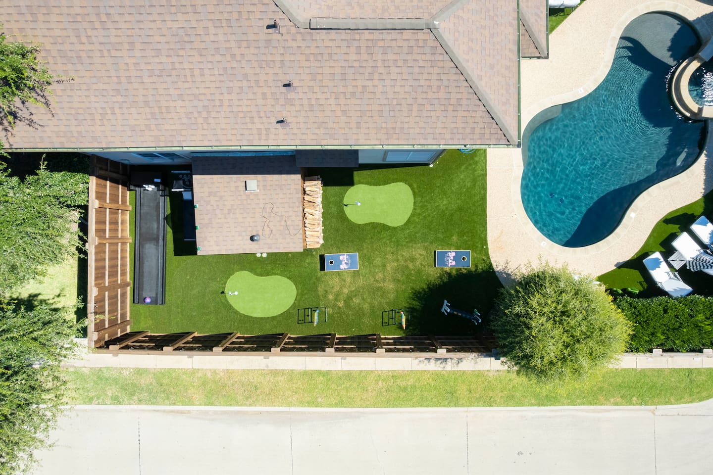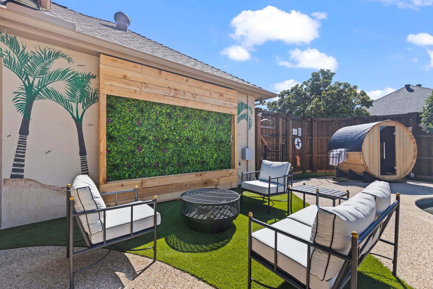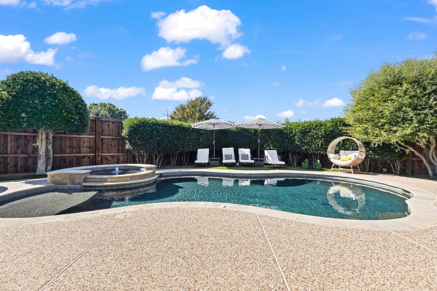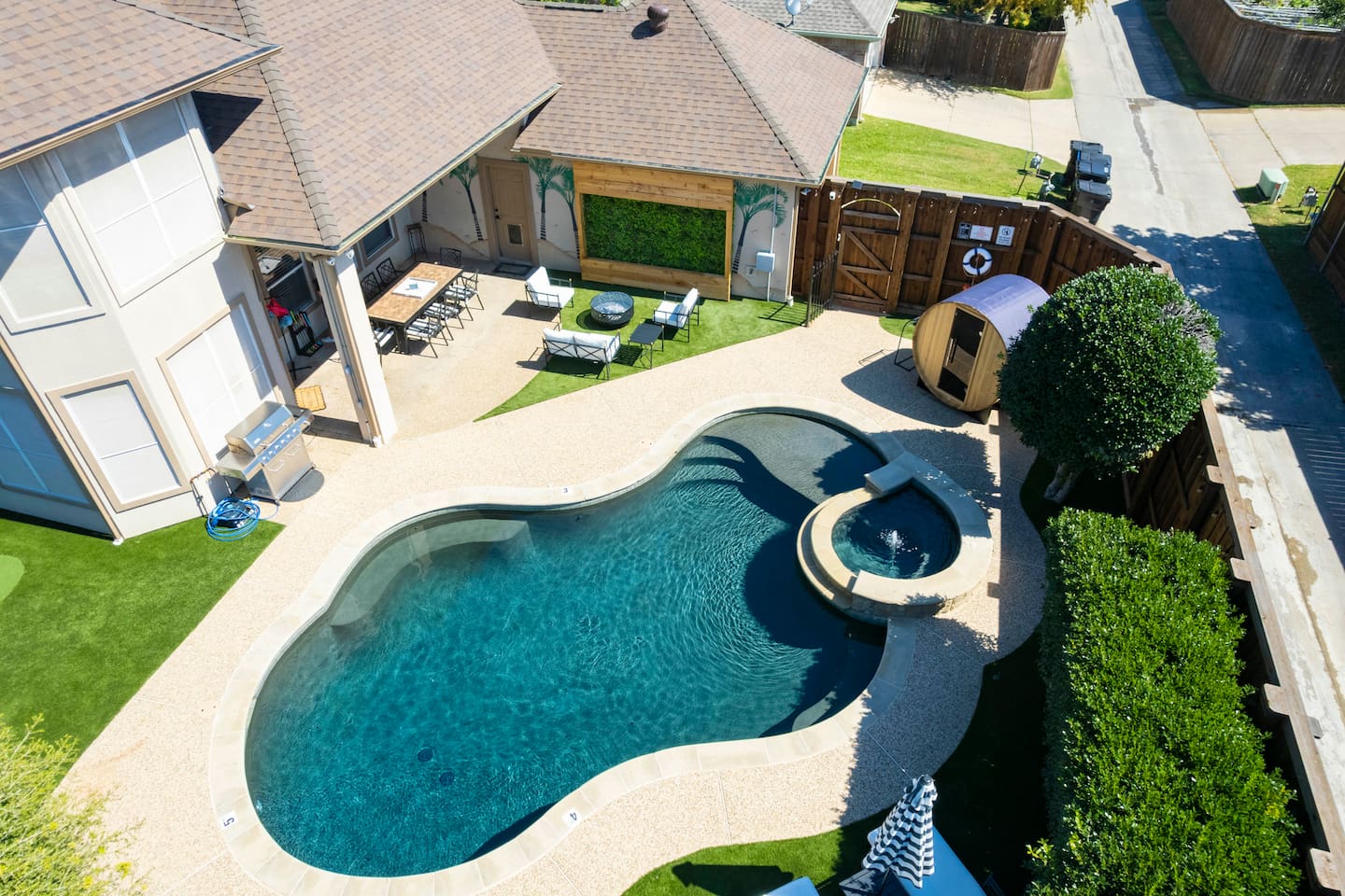 <b>NEARBY ATTRACTIONS</b> 📍 8 minute drive to Downtown Frisco 📍 5 minute drive to Stonebriar Shopping Mall 📍 8 minute drive to PGA and The Star 📍 30 minute drive to DFW Airport 📍 30 minute drive to Dallas Cowboys Stadium 📍 35 minute drive to Downtown Dallas 📍 35 minute drive to American Airlines Center 📍 35 minute drive to Texas State Fair 📍 35 minute drive to DAL Love Field Airport 📍 50 minute drive to Stock Yards in FT Worth <b>AMENITIES</b> 🔥 SAUNA for 3 to 4 adults 🚿 Outdoor Shower (available seasonally; closed in winter due to freeze protection) 🌞 Enjoy the turf grass installed in backyard for a pristine & clean outdoor experience! 🛏️ LUX memory foam mattresses 🔌 All bedrooms have USB ports for easy phone charging 💤 Room darkening curtains for the best sleep 💻 Executive Office w/ docking station 🎮 Brand new arcade games and electronic multi game table! 🎲 Tons of Board Games and Digital Arcade games! 🎲 Jumbo Connect 4 in the yard! 🦩 Pump provided for the pool floats 🍹 Outdoor 8-person Dining Table ⛱️ Outdoor 4 Chaise Lounges with Umbrellas 🍽️ Grill/Griddle combo with gas line 🍼 Baby-friendly items - (Crib, High Chair, White Noise Machine, Monitor, Utensils) 🍉 Fully stocked kitchen- (Instant Pot, Blender, Coffee Maker, Toaster) 🍿 TV streaming (login not provided) 🎳 Outdoor bowling & skee ball ☕ Fully stocked coffee bar with syrups and a variety of creamers 🛜 500 mbps internet <b>Welcome to Your Perfect Retreat!</b> This beautifully updated and fully furnished home is ideal for families or remote workers seeking comfort and convenience. Nestled in a family-friendly neighborhood, this spacious property offers a blend of modern amenities and outdoor leisure. <b>HIGHLIGHTS</b> <b>Work from Home Ready: </b>Large office with an executive desk, a robust docking station, 27-inch 4K monitor, and all necessary peripherals including a mouse, keyboard, webcam, and headphones. <b>Entertainment Galore:</B> Enjoy a luxurious living room with a 75-inch TV and surround sound system. Stream your favorite movies and music effortlessly. <b>Gourmet Kitchen</b> Fully equipped kitchen featuring a new fridge, countertops, and essential cooking utensils. Includes a coffee machine (with Keurig cups), toaster, oven, George Foreman grill, blender, electric can opener, instant pot, and microwave. <b>Expansive Backyard:</b> Private yard with a griddle, outdoor seating, loungers, a large pool with built-in bench, and a spa—perfect for relaxing after a long day. The yard is entirely renovated with turf. <b>ACCOMODATIONS</b> <b>Main Bedroom:</b> Spacious king bedroom on ground floor with a 75-inch TV and large full length mirror. <b>Master Bath:</b> Fully renovated with modern fixtures connecting the master bedroom to the walk-in closet featuring a double vanity and XL shower and soaking tub. <b>Second Bedroom:</b> Overlooks the yard with a king bed and 58-inch Google TV (Chromecast and Airplay compatible). <b>Third Bedroom:</b> Features a king bed and 58-inch Google TV, perfect for unwinding after a busy day. <b>Fourth Bedroom:</b> Fun space for kids with a bunk bed (full/twin) and a climbing wall. Includes a twin mattress in a pull-out trundle. <b>Upstairs Full Baths:</b> Two Fully renovated with modern fixtures featuring a bathtub/shower combo. <b>Game room: </b> Game room with a Queen sleeper sofa (max 500 lbs), xbox, arcade, arcade play table. (note: this room is not darkened it does have blinds but gets light from living room as well). Equipped with a 58-inch TV, Xbox Series S with 2 Controllers, and pre-installed games. Includes a comfortable lounge seat with USB outlets and a kid-friendly desk for homework. <b>Laundry Room:</b> Convenient access to a large washer and dryer with direct garage access. Laundry detergent and Oxi Clean available for your use. <b>Powder Bath:</b> Fully renovated with modern fixtures. <b>What’s Included</b> <b>Utilities:</b> Water, Gas, Electric, AT&T Fiber Internet <b>Maintenance:</b>Yard maintenance on Wednesday's <b>Maintenance:</b>Pool maintenance on Wednesday's between 8am and 12pm. <b>Maintenance:</b>Bug and pest control services <b>Important Information</b> <b>Pool Heating:</b> The pool can be heated for an additional $100 per day with a 2-day minimum. Pool heating may take 24–48 hours to reach the desired temperature, depending on outdoor conditions and current water temperature. Pool heating is billed per day the heater is running, including any pre-heating days required to reach temperature.Spa heating is complimentary. When requesting a reservation, please indicate if you would like the pool heated. When pool heating is requested please be aware that when using the SPA pool heating is paused as it uses the same water heater. During freezing or near-freezing temperatures, the heater may automatically pause as part of built-in freeze-protection safety systems. <b>Indoor TV’s:</b> All indoor TVs are Google TV’s that both support Airplay and Chromecast so you can easily stream music or videos from your phone. <b>AMENITIES FOR YOUR USE</b> <b>Toiletries:</b> Shampoo, Conditioner, Body Wash, Bubble Bath. <b>Kitchen:</b>Instant Pot, Kettle, Coffee Machine, Coffee Syrups and Creamers, Blender, Electric Can Opener, George Foreman Panini Press, Toaster, Stocked Spices, Sugar, Flour, Oil. <b>Other Supplies we provide:</b>Lysol Wipes, Paper Towels, Dyson Vacuum, All cleaning supplies. * Indoor fireplace is non operational.