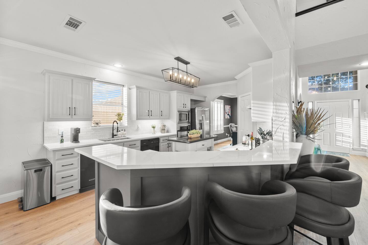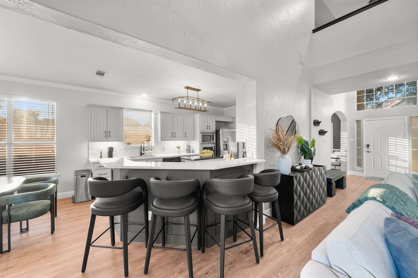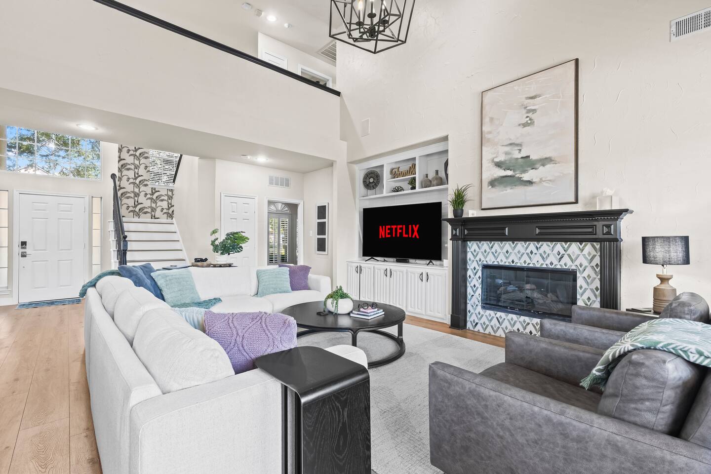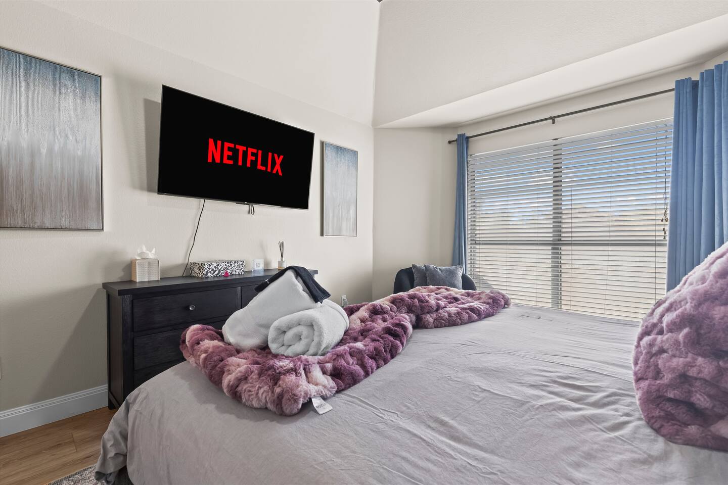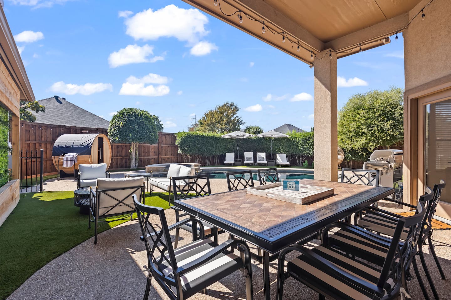 <b>NEARBY ATTRACTIONS</b> 📍 8 minute drive to Downtown Frisco 📍 5 minute drive to Stonebriar Shopping Mall 📍 8 minute drive to PGA and The Star 📍 30 minute drive to DFW Airport 📍 30 minute drive to Dallas Cowboys Stadium 📍 35 minute drive to Downtown Dallas 📍 35 minute drive to American Airlines Center 📍 35 minute drive to Texas State Fair 📍 35 minute drive to DAL Love Field Airport 📍 50 minute drive to Stock Yards in FT Worth <b>AMENITIES</b> 🔥 SAUNA for 3 to 4 adults 🚿 Outdoor Shower (available seasonally; closed in winter due to freeze protection) 🌞 Enjoy the turf grass installed in backyard for a pristine & clean outdoor experience! 🛏️ LUX memory foam mattresses 🔌 All bedrooms have USB ports for easy phone charging 💤 Room darkening curtains for the best sleep 💻 Executive Office w/ docking station 🎮 Brand new arcade games and electronic multi game table! 🎲 Tons of Board Games and Digital Arcade games! 🎲 Jumbo Connect 4 in the yard! 🦩 Pump provided for the pool floats 🍹 Outdoor 8-person Dining Table ⛱️ Outdoor 4 Chaise Lounges with Umbrellas 🍽️ Grill/Griddle combo with gas line 🍼 Baby-friendly items - (Crib, High Chair, White Noise Machine, Monitor, Utensils) 🍉 Fully stocked kitchen- (Instant Pot, Blender, Coffee Maker, Toaster) 🍿 TV streaming (login not provided) 🎳 Outdoor bowling & skee ball ☕ Fully stocked coffee bar with syrups and a variety of creamers 🛜 500 mbps internet <b>Welcome to Your Perfect Retreat!</b> This beautifully updated and fully furnished home is ideal for families or remote workers seeking comfort and convenience. Nestled in a family-friendly neighborhood, this spacious property offers a blend of modern amenities and outdoor leisure. <b>HIGHLIGHTS</b> <b>Work from Home Ready: </b>Large office with an executive desk, a robust docking station, 27-inch 4K monitor, and all necessary peripherals including a mouse, keyboard, webcam, and headphones. <b>Entertainment Galore:</B> Enjoy a luxurious living room with a 75-inch TV and surround sound system. Stream your favorite movies and music effortlessly. <b>Gourmet Kitchen</b> Fully equipped kitchen featuring a new fridge, countertops, and essential cooking utensils. Includes a coffee machine (with Keurig cups), toaster, oven, George Foreman grill, blender, electric can opener, instant pot, and microwave. <b>Expansive Backyard:</b> Private yard with a griddle, outdoor seating, loungers, a large pool with built-in bench, and a spa—perfect for relaxing after a long day. The yard is entirely renovated with turf. <b>ACCOMODATIONS</b> <b>Main Bedroom:</b> Spacious king bedroom on ground floor with a 75-inch TV and large full length mirror. <b>Master Bath:</b> Fully renovated with modern fixtures connecting the master bedroom to the walk-in closet featuring a double vanity and XL shower and soaking tub. <b>Second Bedroom:</b> Overlooks the yard with a king bed and 58-inch Google TV (Chromecast and Airplay compatible). <b>Third Bedroom:</b> Features a king bed and 58-inch Google TV, perfect for unwinding after a busy day. <b>Fourth Bedroom:</b> Fun space for kids with a bunk bed (full/twin) and a climbing wall. Includes a twin mattress in a pull-out trundle. <b>Upstairs Full Baths:</b> Two Fully renovated with modern fixtures featuring a bathtub/shower combo. <b>Game room: </b> Game room with a Queen sleeper sofa (max 500 lbs), xbox, arcade, arcade play table. (note: this room is not darkened it does have blinds but gets light from living room as well). Equipped with a 58-inch TV, Xbox Series S with 2 Controllers, and pre-installed games. Includes a comfortable lounge seat with USB outlets and a kid-friendly desk for homework. <b>Laundry Room:</b> Convenient access to a large washer and dryer with direct garage access. Laundry detergent and Oxi Clean available for your use. <b>Powder Bath:</b> Fully renovated with modern fixtures. <b>What’s Included</b> <b>Utilities:</b> Water, Gas, Electric, AT&T Fiber Internet <b>Maintenance:</b>Yard maintenance on Wednesday's <b>Maintenance:</b>Pool maintenance on Wednesday's between 8am and 12pm. <b>Maintenance:</b>Bug and pest control services <b>Important Information</b> <b>Pool Heating:</b> The pool can be heated for an additional $100 per day with a 2-day minimum. Pool heating may take 24–48 hours to reach the desired temperature, depending on outdoor conditions and current water temperature. Pool heating is billed per day the heater is running, including any pre-heating days required to reach temperature.Spa heating is complimentary. When requesting a reservation, please indicate if you would like the pool heated. When pool heating is requested please be aware that when using the SPA pool heating is paused as it uses the same water heater. During freezing or near-freezing temperatures, the heater may automatically pause as part of built-in freeze-protection safety systems. <b>Indoor TV’s:</b> All indoor TVs are Google TV’s that both support Airplay and Chromecast so you can easily stream music or videos from your phone. <b>AMENITIES FOR YOUR USE</b> <b>Toiletries:</b> Shampoo, Conditioner, Body Wash, Bubble Bath. <b>Kitchen:</b>Instant Pot, Kettle, Coffee Machine, Coffee Syrups and Creamers, Blender, Electric Can Opener, George Foreman Panini Press, Toaster, Stocked Spices, Sugar, Flour, Oil. <b>Other Supplies we provide:</b>Lysol Wipes, Paper Towels, Dyson Vacuum, All cleaning supplies. * Indoor fireplace is non operational.